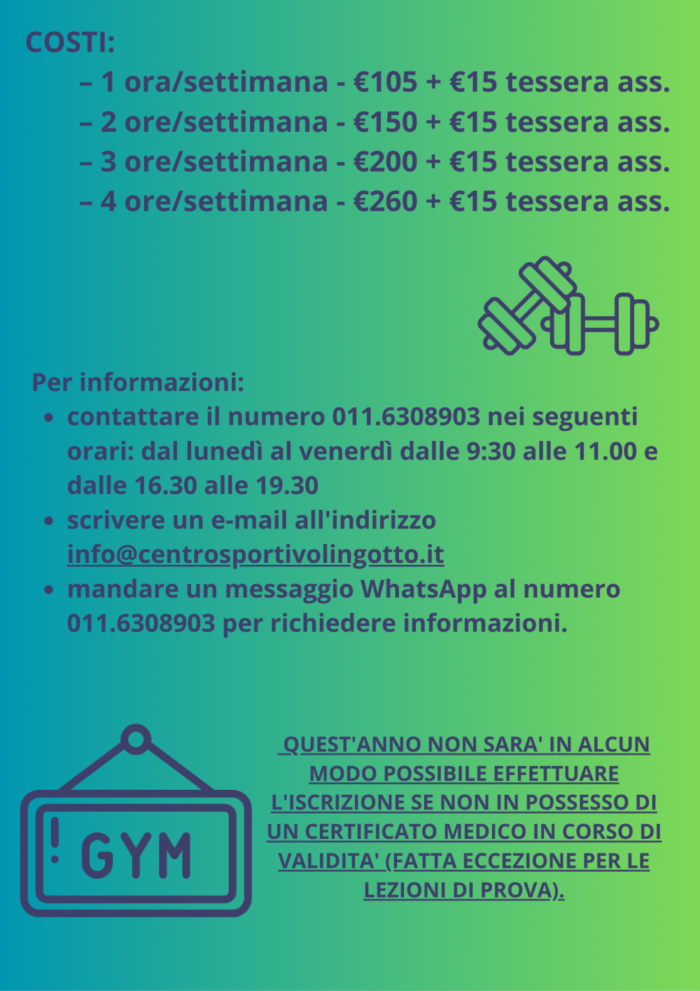 - 3 ore /settimana - €200 + €15 TESSERAMENTO UNA TANTUM